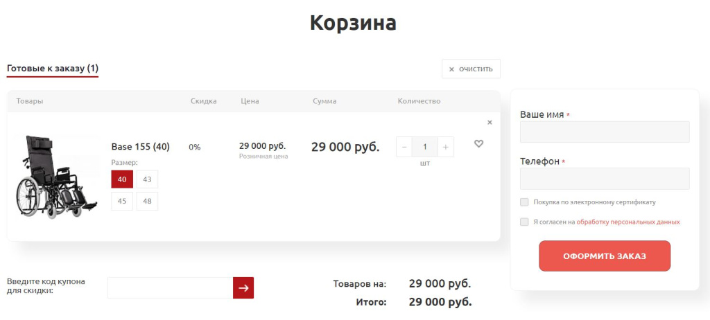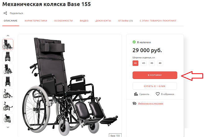 3.   Для оформления заказа на сайте выбираем необходимый ТСР (например, коляска Base 155) и нажимаем «В корзину». 3cert.png