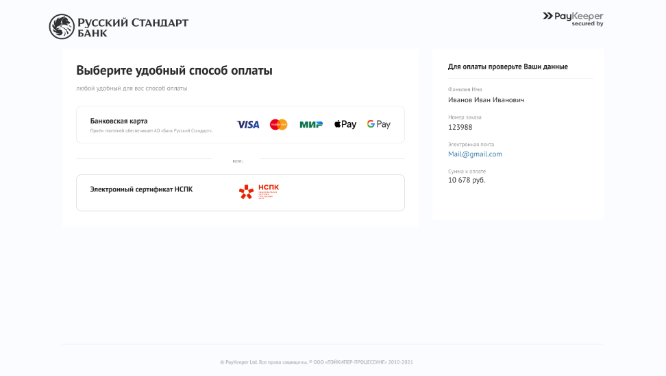 8. При нажатии кнопки «Оплатить счет» плательщик попадает на страницу оплаты, где нужно выбрать способ оплаты «Электронный сертификат НСПК».