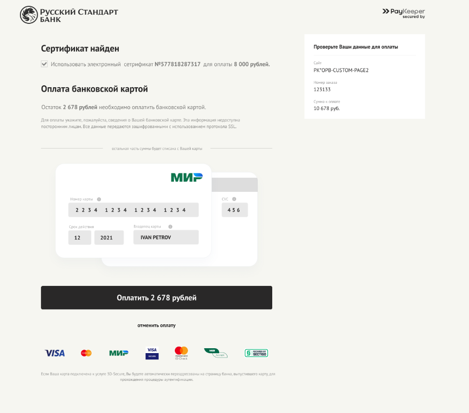 9. Электронный сертификат привязан к карте МИР. Плательщик вводит свою карту, и система автоматически находит сертификаты, которыми можно оплатить весь заказ или его часть.